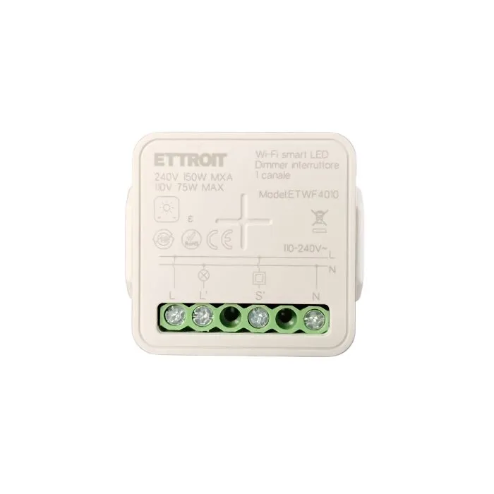 Il micromodulo smart WiFi ETTROIT ETWF4010 è un interruttore dimmer da incasso progettato per il controllo intelligente dell’illuminazione LED, consentendo la regolazione dell’intensità luminosa in modo preciso e automatizzato.