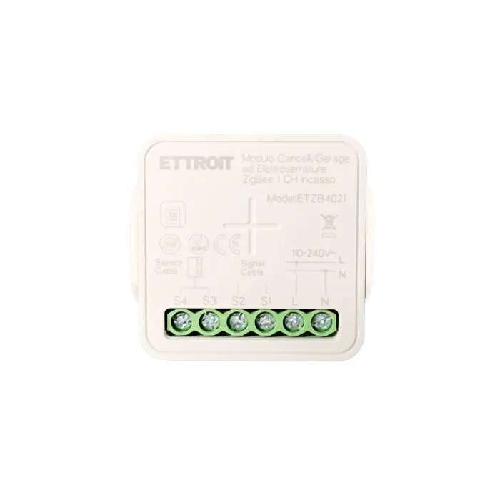 Il micromodulo smart Zigbee ETTROIT ETZB4021 è progettato per il controllo intelligente di cancelli automatici, porte garage ed elettroserrature, consentendo la gestione degli accessi tramite comando remoto.