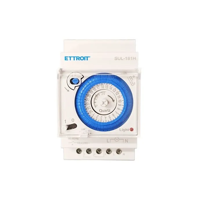 Interruttore orario analogico ETTROIT SUL181H progettato per il controllo automatico di carichi elettrici su base giornaliera. Ideale per applicazioni come illuminazione, ventilazione, pompe e automazioni, consente la gestione precisa degli orari di accensione e spegnimento.