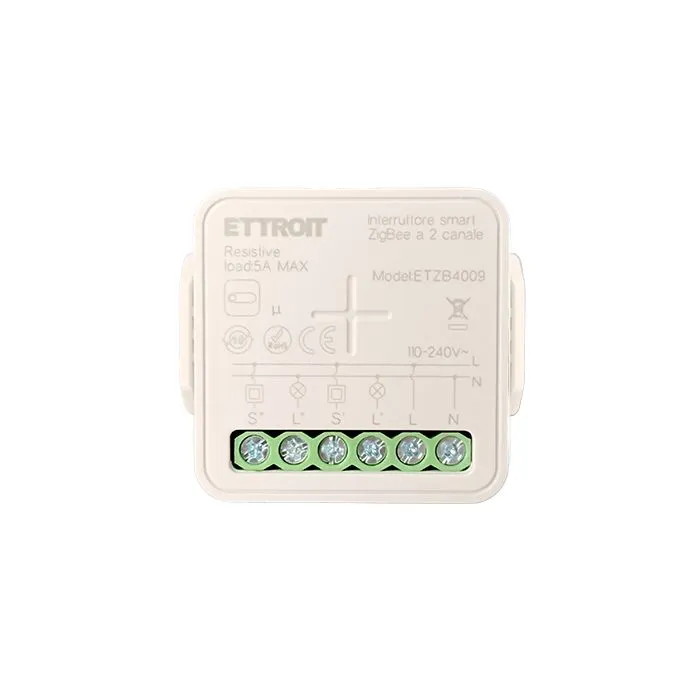Il micromodulo smart Zigbee ETTROIT ETZB4009 è un interruttore da incasso progettato per il controllo intelligente di 2 canali indipendenti, ideale per la gestione di luci e carichi elettrici in impianti domotici.